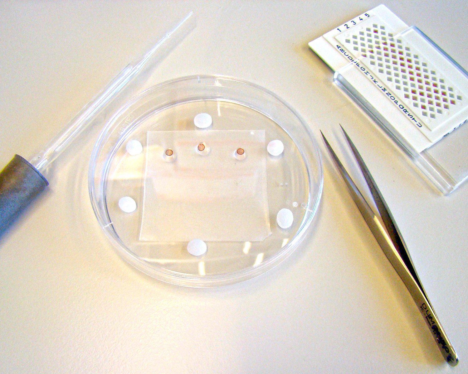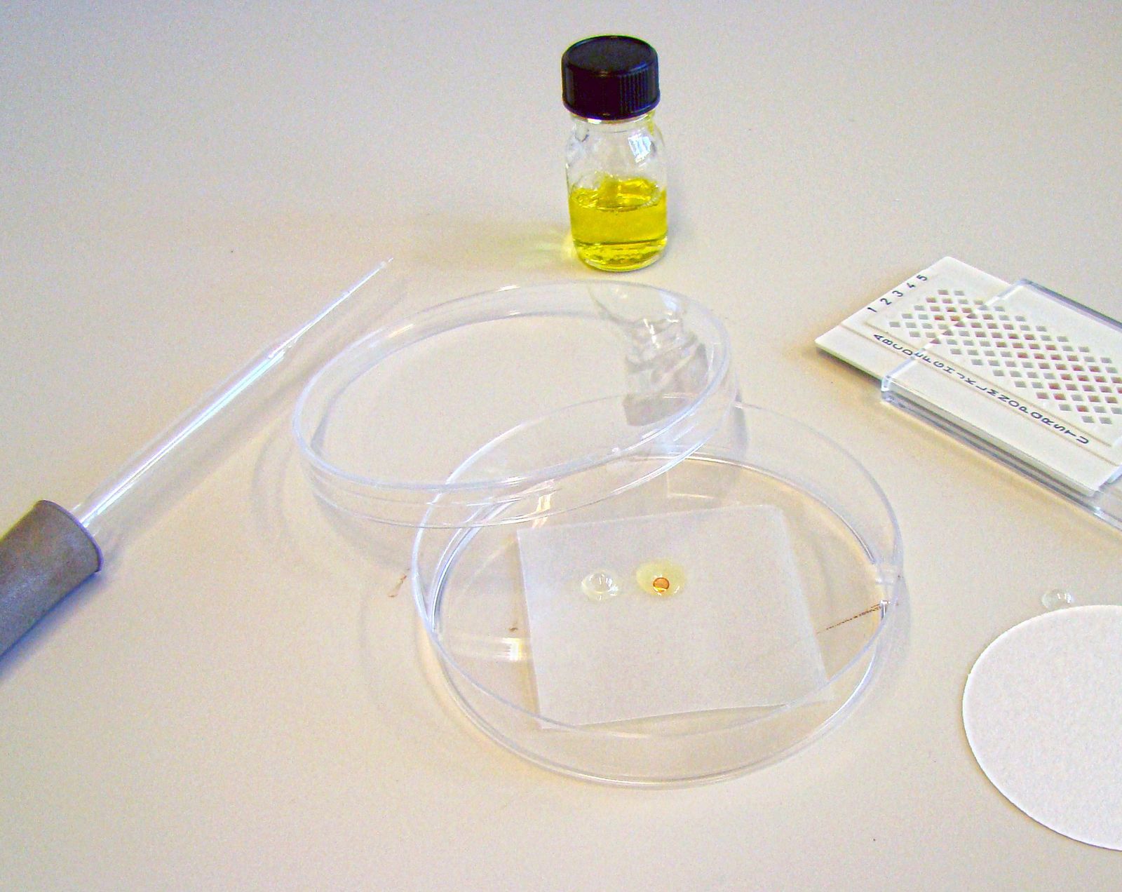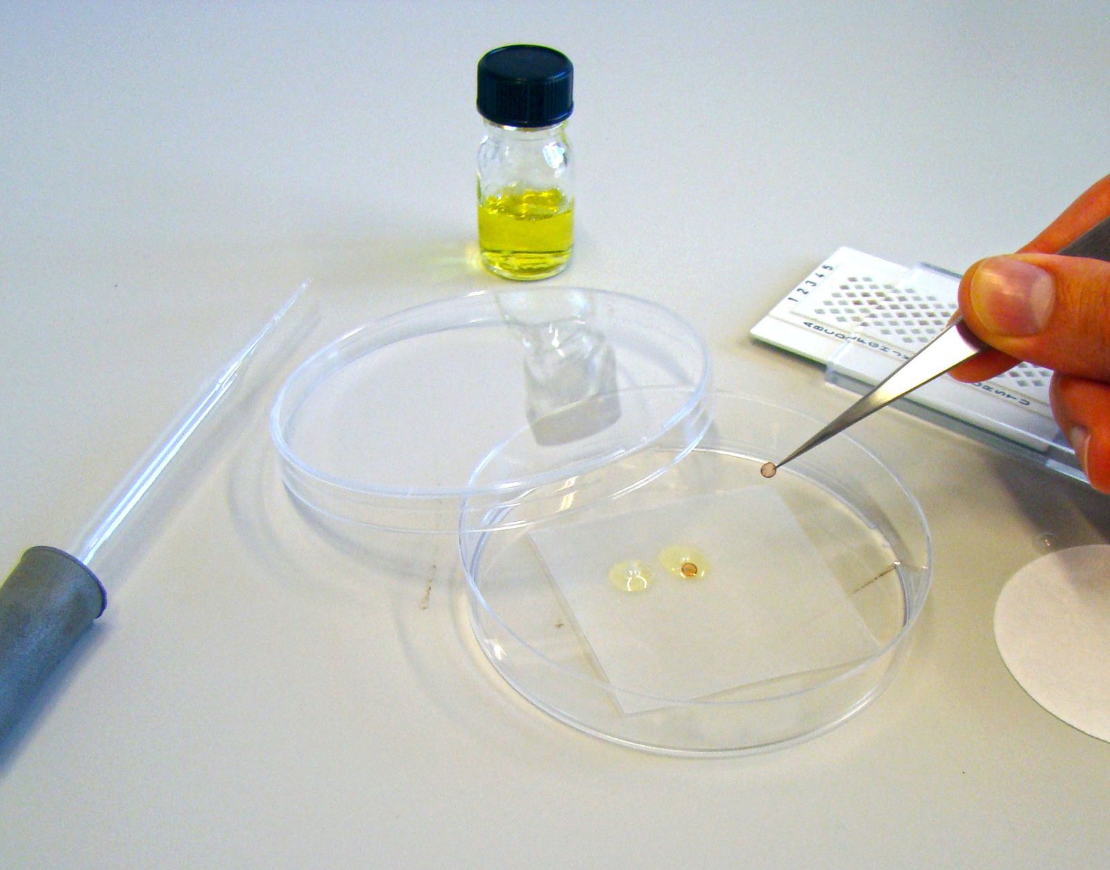 在为电子显微镜准备标本时,手工染色切片是大多数失败的步骤。在这里,网格被放置在醋酸铀酰(UA)溶液滴上,在一定的孵育时间后用镊子取出(图8a和8b)。然后将网格在水中冲洗几次,然后放在柠檬酸铅滴上孵育(图9a和9b)。以防止柠檬酸铅因暴露于一氧化碳而沉淀2,氢氧化钠颗粒被添加到染色皿中(这里是一个有盖培养皿)以排除大气中的CO2.此外,冲洗水应该是CO2无(双蒸馏)。染色后,用几个水浴和喷射水再次冲洗网格(图9c)。排汗和干燥后,网格就可以分析了。
