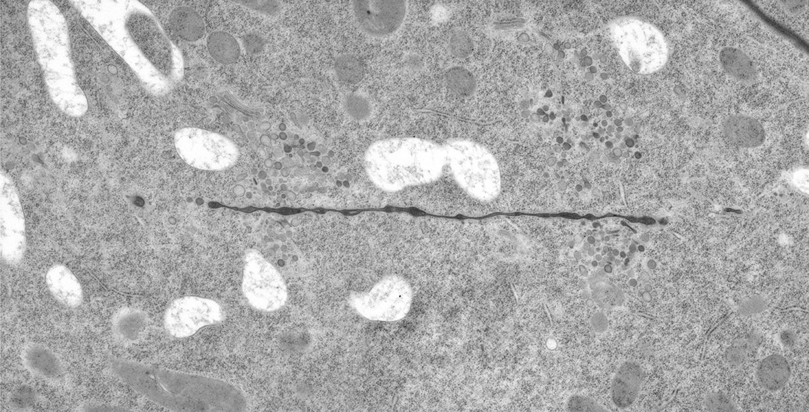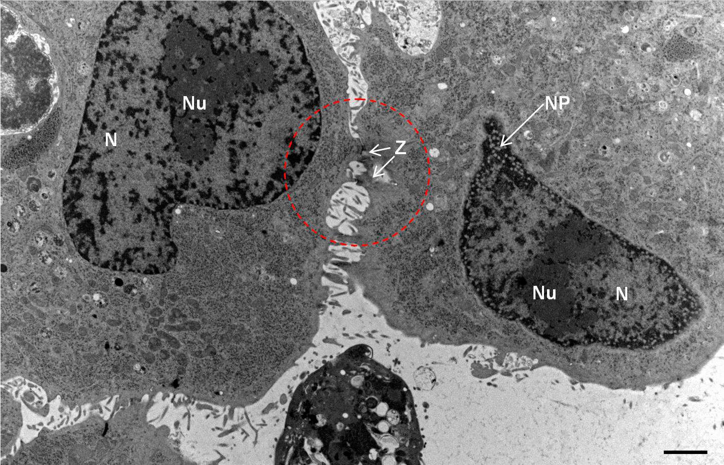 使用超微切片机(徕卡EM UC6)和后染色在一个徕卡EM AC20在20°C乙酸铀酰中浸泡40分钟,在20°C柠檬酸铅中浸泡10分钟。