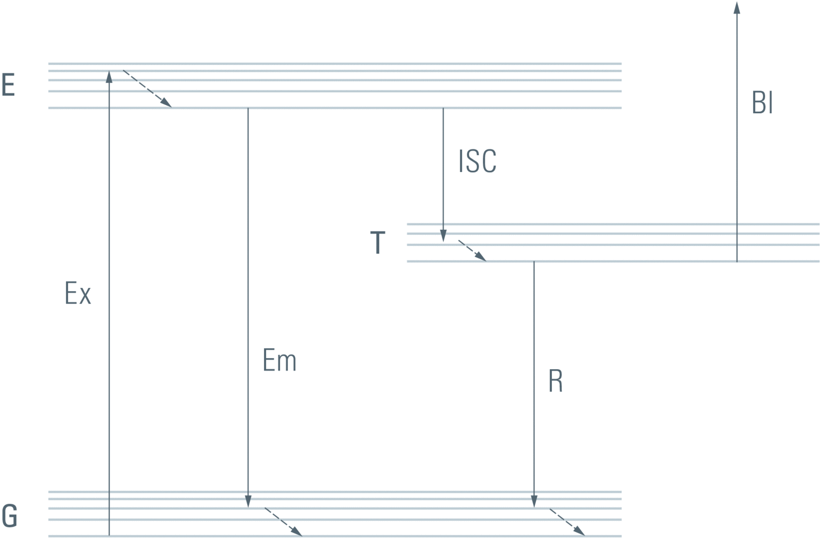 根据分子的不同,激发态也有可能被耗尽的其他途径。最突出的非荧光方式之一是所谓的“系统间交叉”,ISC。在这里,分子进入一个在能量上介于E和g之间的状态,由于量子力学的原因,这个状态被称为“三重态”T,从这里到基态的衰变非常缓慢。因此,分子在一段时间内处于三重态。还有其他的状态,其中荧光色素是不荧光的,特别是最重要的荧光蛋白显示各种各样的“暗态”,不一定是三重态。这里报告的荧光产率的发现也适用于非三态暗态。不可逆的氟铬破坏(漂白)可能需要不同的论证。
