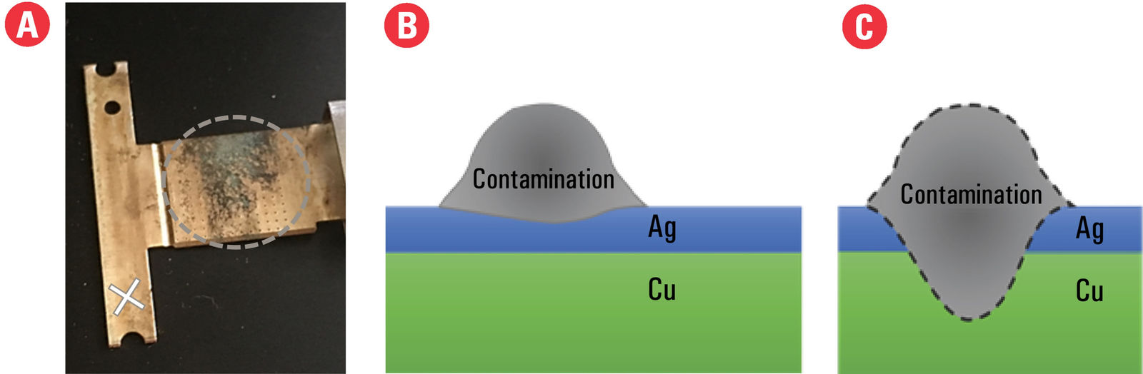 检查的目的是找出污染物仅存在于表面上(图2B)或反应已损坏下面的Ag层(图2C)。