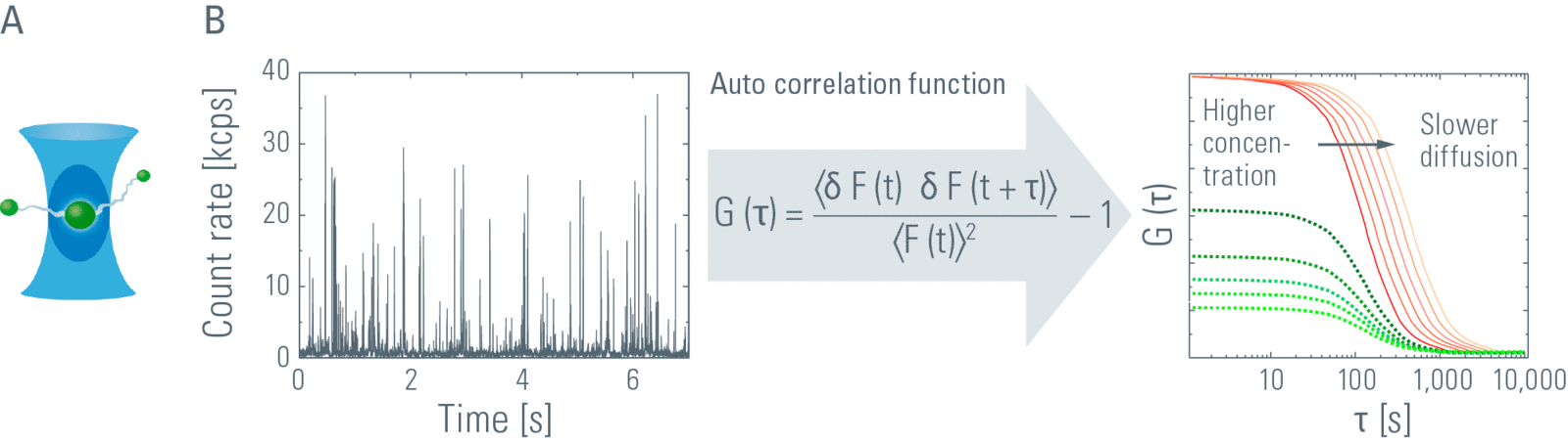 这个实验本质上是基于布朗运动的:分子扩散通过探测体,被激发并发光。测量的对象是由此产生的荧光强度的时间变化(图1B),但它也可能受到其他光物理过程的影响。