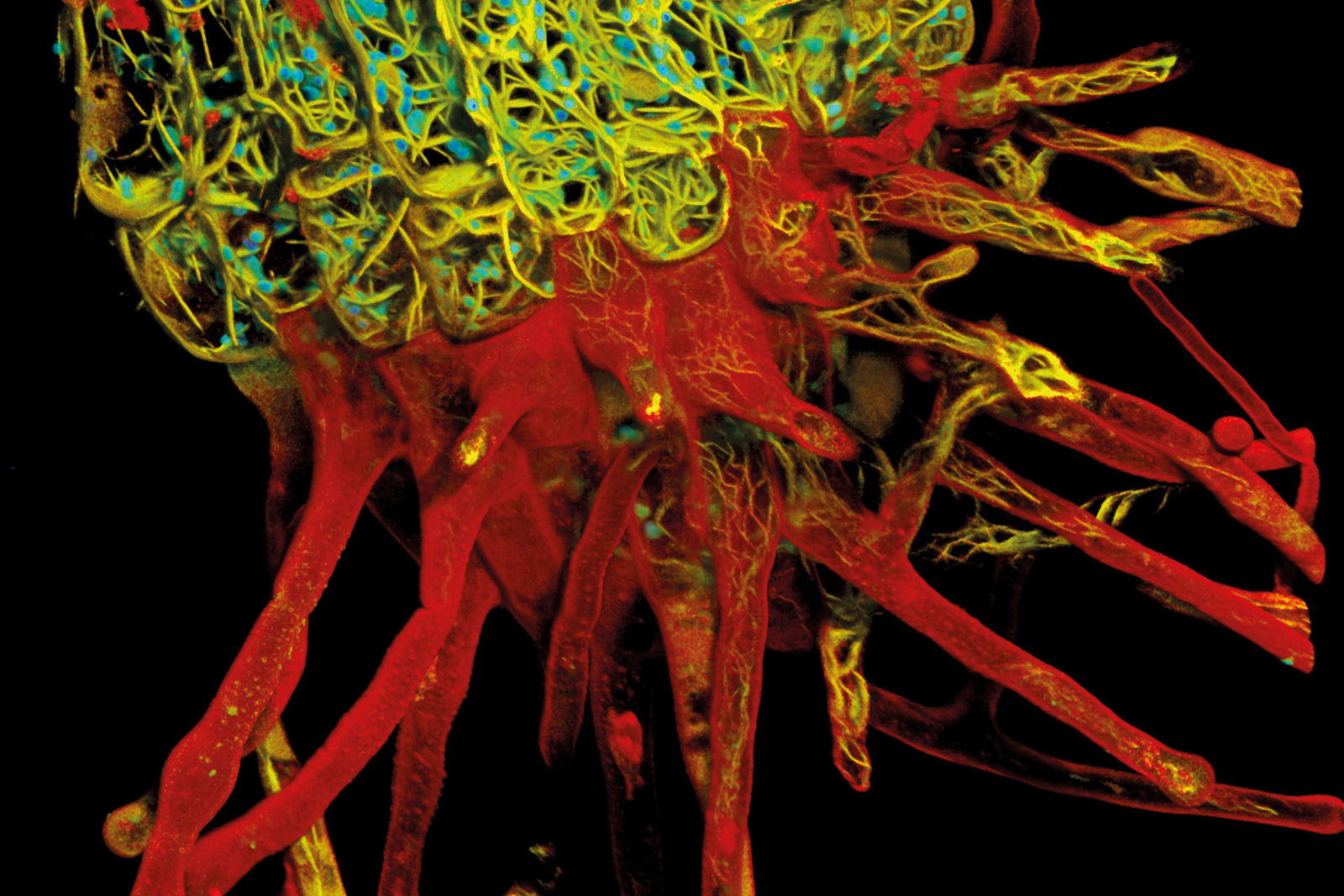 Nematostella vectensis(Cnidaria)体内成像的快速3D显示纤毛,线虫和自由循环Cnidycytes(绿色)和葡聚糖红色荧光(洋红色)的内源信号。通过在12分45秒内获得的30分钟内通过抖动的内源性信号和荧光分离。秤条,50μm。Anniek Stokkerman和Aissam Ikmi的样本由Embl Heidelberg提供。