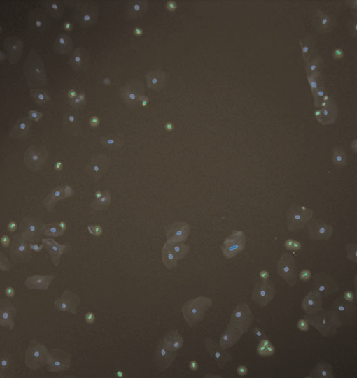 在精子hy - l™中使用的单克隆抗体提供了前所未有的特异性,允许从以前无法搜索的样本中识别人类精子。此外,荧光显微镜的信噪比优势(以及完全优化的SPERM hyl™kit的极低背景)使精子检测的灵敏度比目前的亮场显微镜技术提高了几个数量级。DAPI和Alexa染料的结合是为图像处理软件设计的,这样精子识别基本上可以自动化。通过使用计算机辅助图像分析软件,精子hy - l™染色制剂可以首先扫描“特征”,即:那fluorescent signals above background – and second, these features can then be analyzed further for the color (or hue) of the observed fluorescence. Only those features that have both DAPI (from the DNA) and the Alexa 488 (from the monoclonal antibody) fluorescence would be scored by the software as sperm.