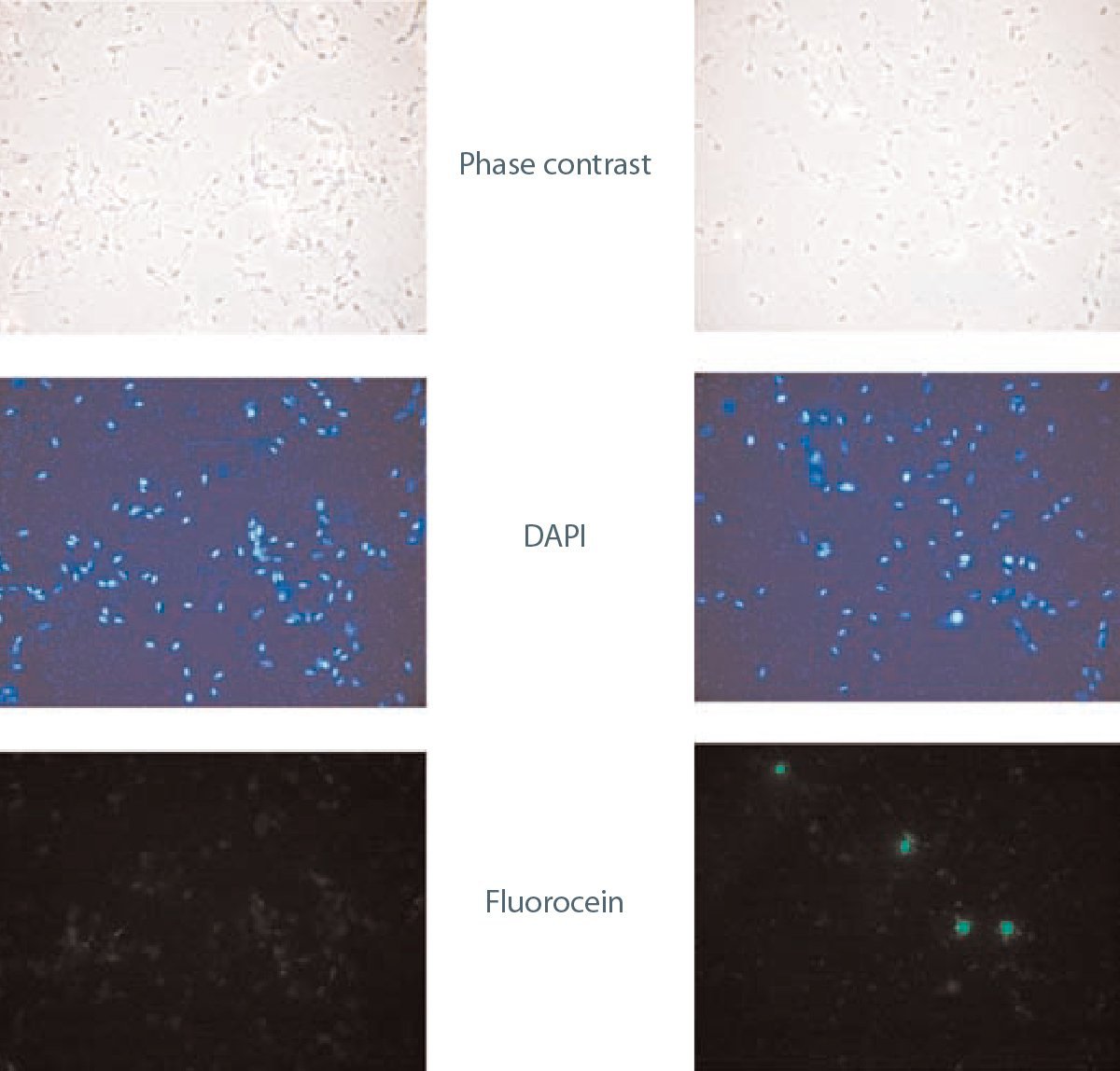 精子的敏感性和细胞类型特异性HY-LITER™从犯罪实验室提供的图片展示了个案工作的验证研究精子HY-LITER™(图2)。在这里诽谤幻灯片由性侵犯护士考官从阴道拭子从性侵犯受害者收集使用精子染色HY-LITER™。这些类型的载玻片对于犯罪实验室人员来说很难分析精子的存在,因为细胞密度、采集方法和存储条件都会破坏精子细胞的形态,抑制KPIC染色,使得标准的精子鉴定方法几乎不可能。这一系列的图像展示了原始幻灯片的复杂性(见相位对比图像),在准备过程中检测精子的能力(见合并相位和FITC图像),以及可以同时识别上皮和精子细胞的过程中的确认步骤(参见组合的双立方体和相位对比图像)。精子Hy-升™在制剂的所有层中染色精子。