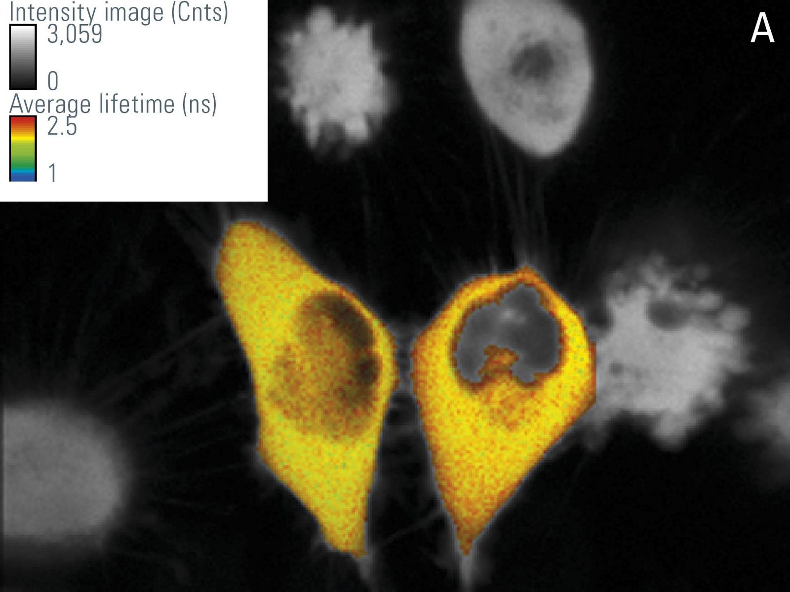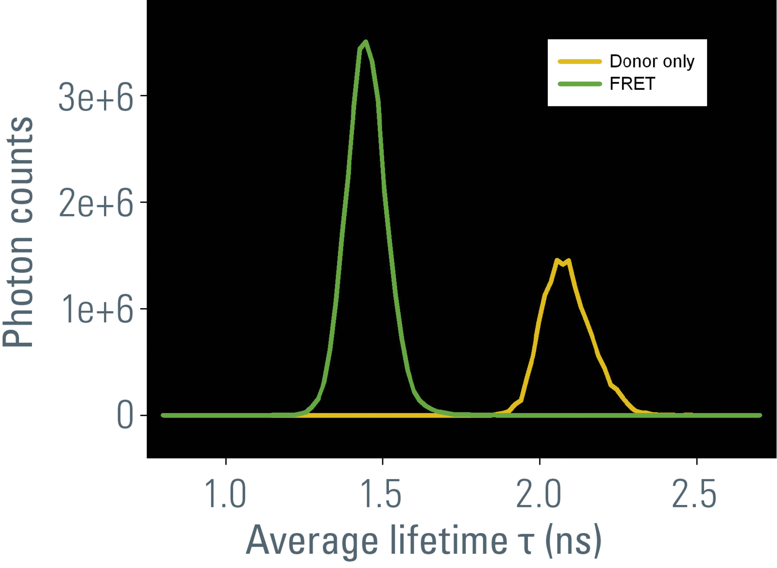 自烦恼减少供体寿命的程度可以量化烦恼发生,前提是施主生存期没有烦恼是已知的。施主寿命τ作为一个绝对参考烦恼样品进行了分析。因此,这部电影-烦恼内部校准–这一特性缓解了基于强度的烦恼测量。由于其荧光寿命是染料的固有特性,因此它对其他有害影响(如光漂白、图像着色、不同浓度或表达水平)具有广泛的不变性。