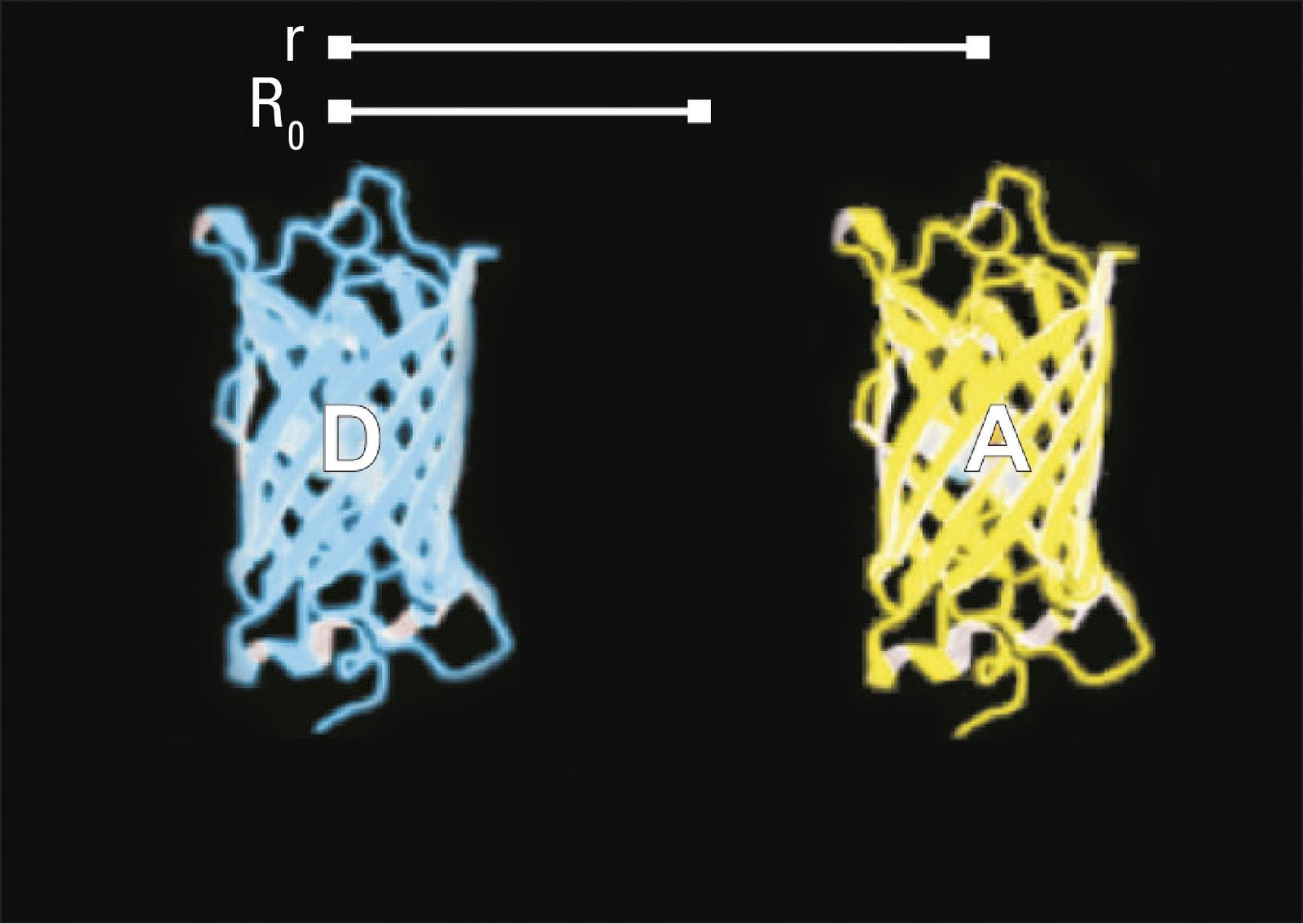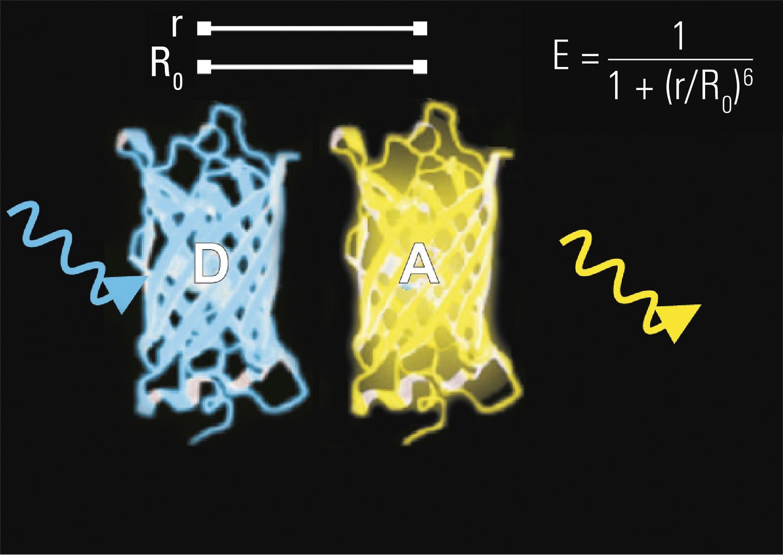因为它与r有很强的距离依赖性–6(图4)烦恼发生在与生化反应高度相关的空间尺度上,如蛋白质-蛋白质或蛋白质- dna相互作用。烦恼可以通过灵敏的荧光读数探测分子间的相互作用。这使得研究人员能够在体外和体内研究分子间的相互作用。通过用合适的荧光标记连接两个感兴趣的相互作用伙伴,可以分析双分子相互作用。或者,烦恼允许构建生物探针报告第二信使浓度或离子强度通过分子内的手段烦恼由于强烈的构象变化。
