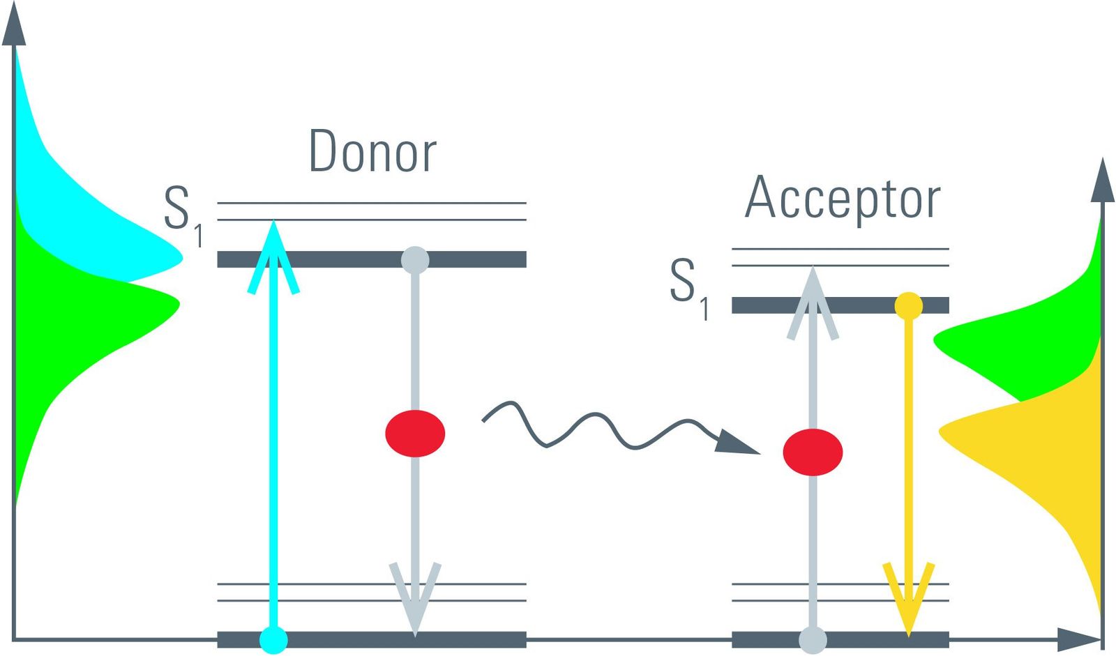 从激发态放松的另一个过程是,例如,烦恼通过烦恼激发能以非辐射方式转移到受体分子。受体反过来可以通过荧光松弛(图5,右图)。由于施主荧光和能量转移是相互竞争的过程,因此在存在荧光的情况下,消耗激发态的速率增加烦恼.有人可能会说,供体分子处于激发态的时间越长,这种可能性就越大烦恼发生。只有来自施主分子的光子被荧光所松弛,才能被观察到。由于受体荧光波长较长,无法检测到转移到受体分子的能量。因此烦恼缩短供体寿命(图6)。