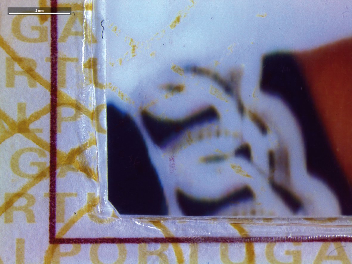 如果只有照片已交换,并且已经仔细完成,则排版检查或数据读数不提供任何有用的信息。查找线索的唯一方法是显微镜下面。有时,Fischer在桌子的边缘上弯曲身份证,以查看已卡住的照片的边缘。如果他在身份证侧发现撕裂的纤维,那么不对应于照片后面的身份证,案子很清楚。
