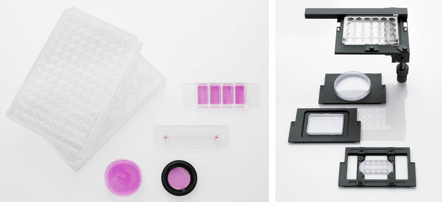 当涉及细胞培养物的显微镜检查时,显微镜必须满足的某些基本特征。哺乳动物细胞在液体培养基中培养的事实是指显微镜必须具有倒配置。在这种结构中,物镜安装在放在显微镜台上的培养容器下面,冷凝器安装在上面。只有这样,物镜才能与标本足够接近。此外,采用这种结构,研究人员在样品周围有了更多的自由空间(图6)。