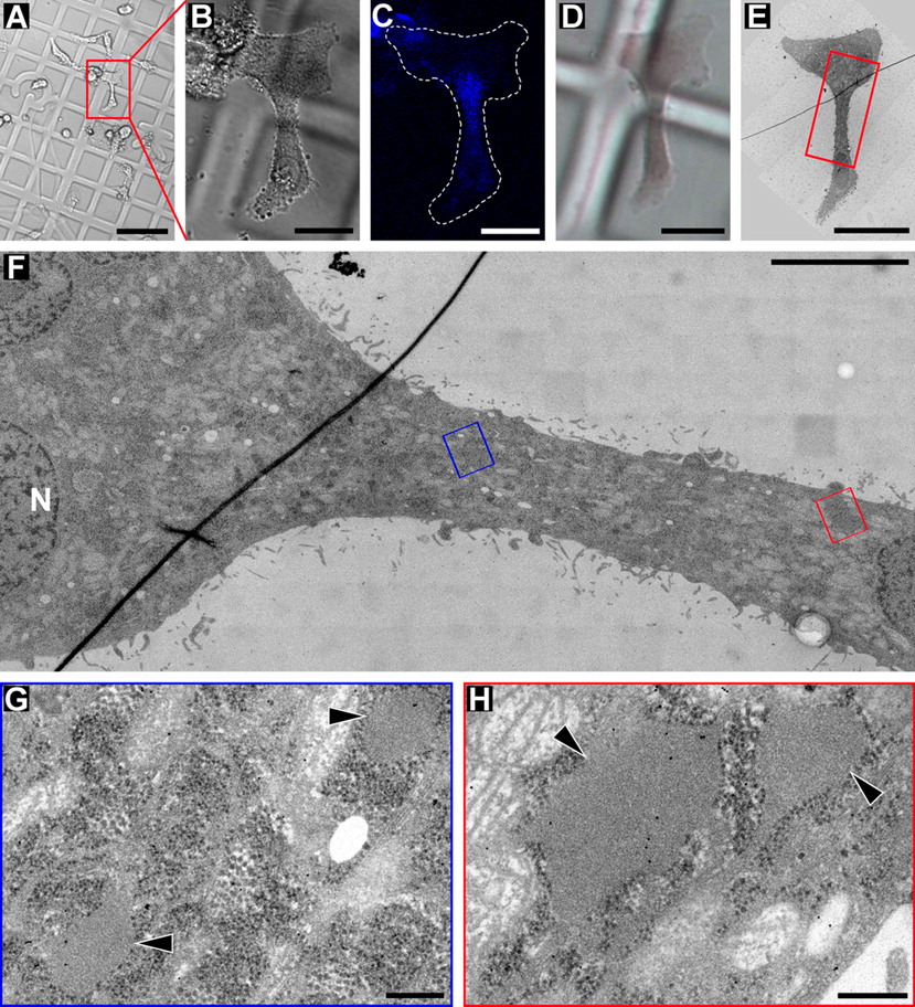 图4:克莱姆高压冷冻和冷冻替代HeLa细胞(使用徕卡em.HPM100和徕卡em.AFS2):一个感兴趣的细胞是由荧光标记物识别的迪拜国际资本(A,B,d)荧光显微镜(C)和em.在低(E),中(F)和高分辨率(G, H)[11].