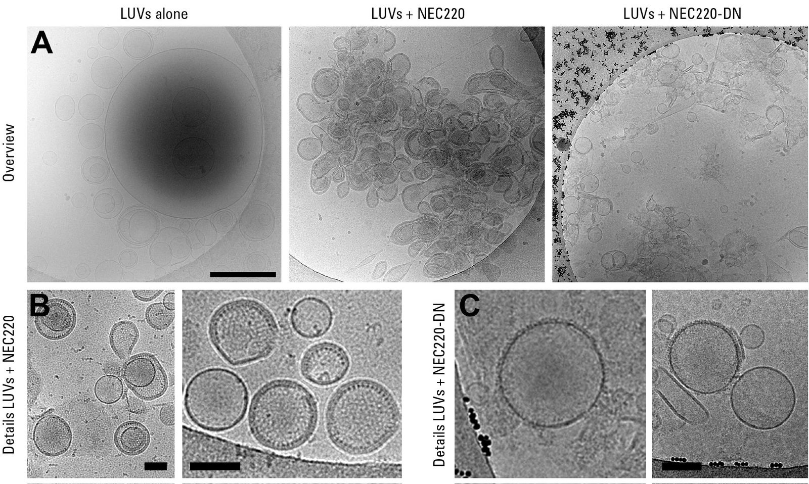 低温电子显微镜(cryo-em.)允许用于生物样品尽可能接近天然状态尽可能的高分辨率结构的观察。相对于传统的em.方法没有化学固定剂,如戊二醛或四氧化锇,或对比增强重金属的污渍,如乙酸双氧铀,被使用。这最大限度地减少固定和染色文物的风险。相反,将样品快速冷冻并同时在温度低于-160被不断地冷却直接在电子显微镜观察°C.对于小样本——蛋白质复合物、脂质体(见图1)、病毒、原核细胞、细胞器——浸泡冷冻(“浸入冷冻”)是样品制备方法的选择[1].使用网格,柱塞这类徕卡EM GP,即典型地是20至500纳米厚的制备和迅速冷却的致冷剂例如在刚刚冷冻剂的熔点以上的温度下冷冻乙烷为了样品的薄膜来实现样品玻璃化[2].较大的样品(最常见的,真核细胞和组织)对于暴跌来说太厚,可以使用高压冷冻,然后用冷冻切片制备。