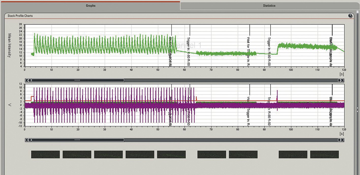 在许多生理应用中,细胞对不同类型刺激的反应是令人感兴趣的。从电强度和荧光强度数据可以看出,细胞的反应需要以同步的方式进行测量和显示。强度数据通常指细胞内钙浓度或pH值。徕卡DM6000 CFS可实现电气和光学数据的同步关联;电压记录与荧光强度数据同步,并自动以图形显示。这揭示了实验进展和在线数据评估的快速和直接概述。此外,图像显示在图形下方,以快速获取有关细胞形态的信息。