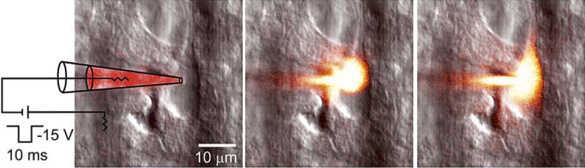 为了研究大脑中的神经元网络,需要具体的单个细胞标记。一种称为单细胞电穿孔(Nevianand Helmchen 2007)的新方法,允许快速和选择性地装载细胞。递送简要的电压脉冲,导致电磁场施加到膜上。这导致小孔隙的瞬态形成;毛孔在几秒钟内关闭。在孔的开口期间在电化学梯度方向上运输带电分子。该方法可用于用钙敏感染料和其他染料载有神经元(图3)。