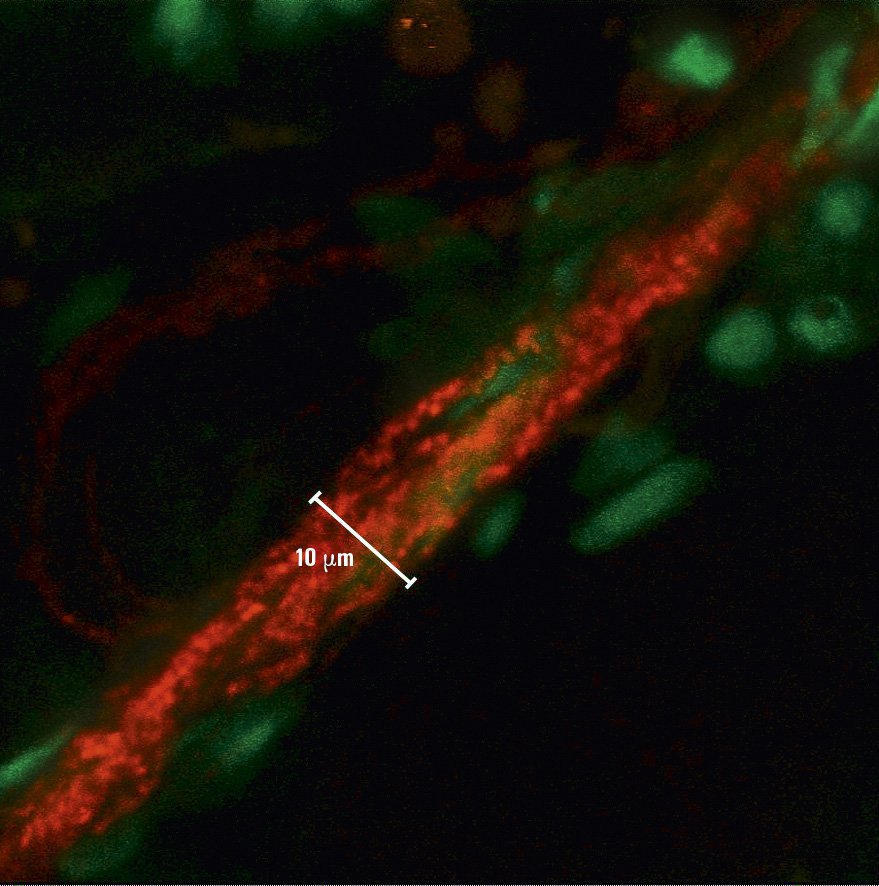 创建的对比度非常强烈,图像看起来与DIC图像。利用透射光检测器或所谓的Dodt检测器检测Dodt梯度对比度图像。Dodt探测器的PMT值较高红外光谱-灵敏度(至…900 nm)相比常规pmt。徕卡DM6000 CFS系统配备NDDs和Dodt检测器,使用时可以同时检测荧光和透射光红外光谱励磁。它提供最高的光子收集效率,因为光束路径中没有光学组件。这也有助于许多生理学应用,例如,光学引导贴片夹紧(图6)。NDDS也适用于检测二次谐波产生信号(SHG)(图7)。使用时,Dodt梯度对比度在相机和扫描模式下工作红外光谱兴奋。它也可用于可见光激发,但对比效果可能不太明显。
