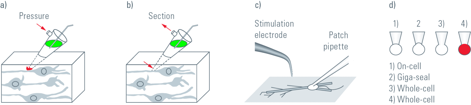 在膜片钳实验中,玻璃吸管和细胞膜之间形成紧密的密封。这种安排使得小电流和电压的记录参与神经元的活动和其他细胞(图1)。一个大野外观测是必要的为了找到感兴趣的区域在一个标本,例如在活老鼠的大脑,大脑生活片,胚胎等。此外,重要的是能够看到详细的结构,以便能够准确地放置样品中的移液管和电极。