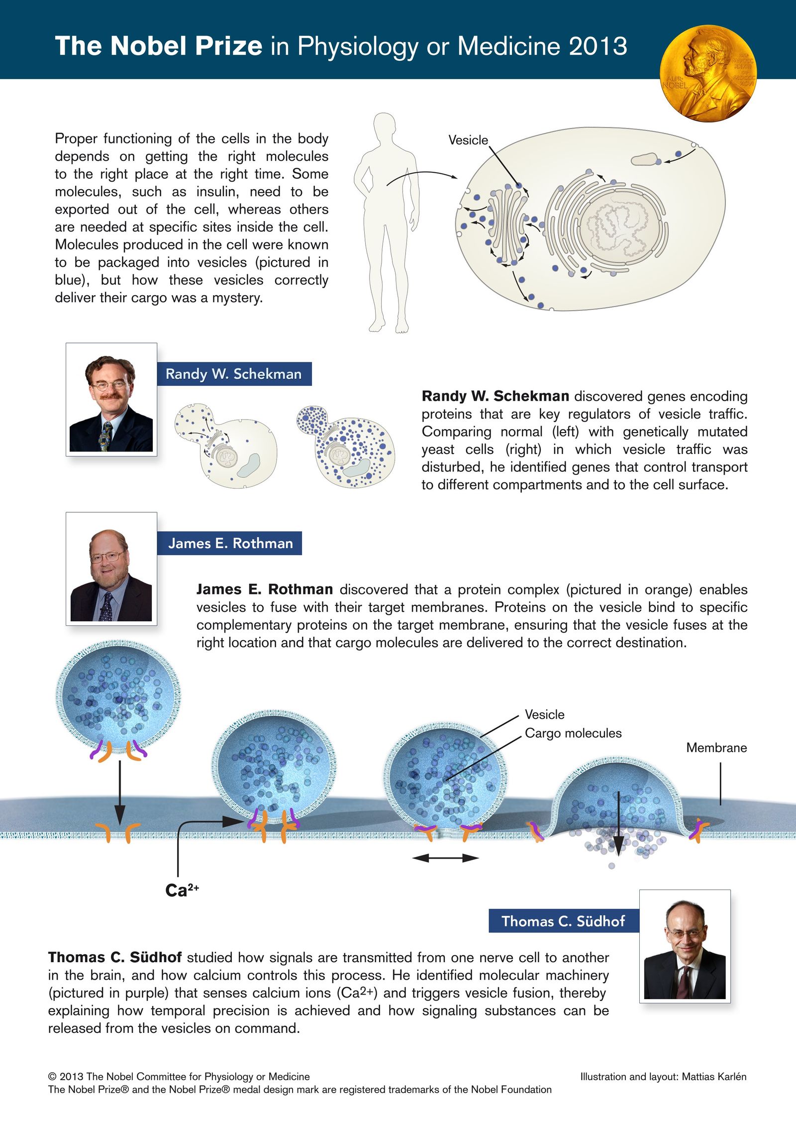 詹姆斯·罗斯曼对细胞运输系统的性质也很感兴趣。在20世纪80年代和90年代研究哺乳动物细胞中的囊泡运输时,Rothman发现一种蛋白质复合物能够使囊泡与它们的目标膜对接并融合。在融合过程中,囊泡和靶膜上的蛋白质相互结合,就像拉链的两边。事实上,有很多这样的蛋白质,而且它们只以特定的组合结合,确保了货物被运送到一个精确的位置。同样的原理在细胞内部也起作用,当囊泡与细胞外膜结合并释放其内容物时。
