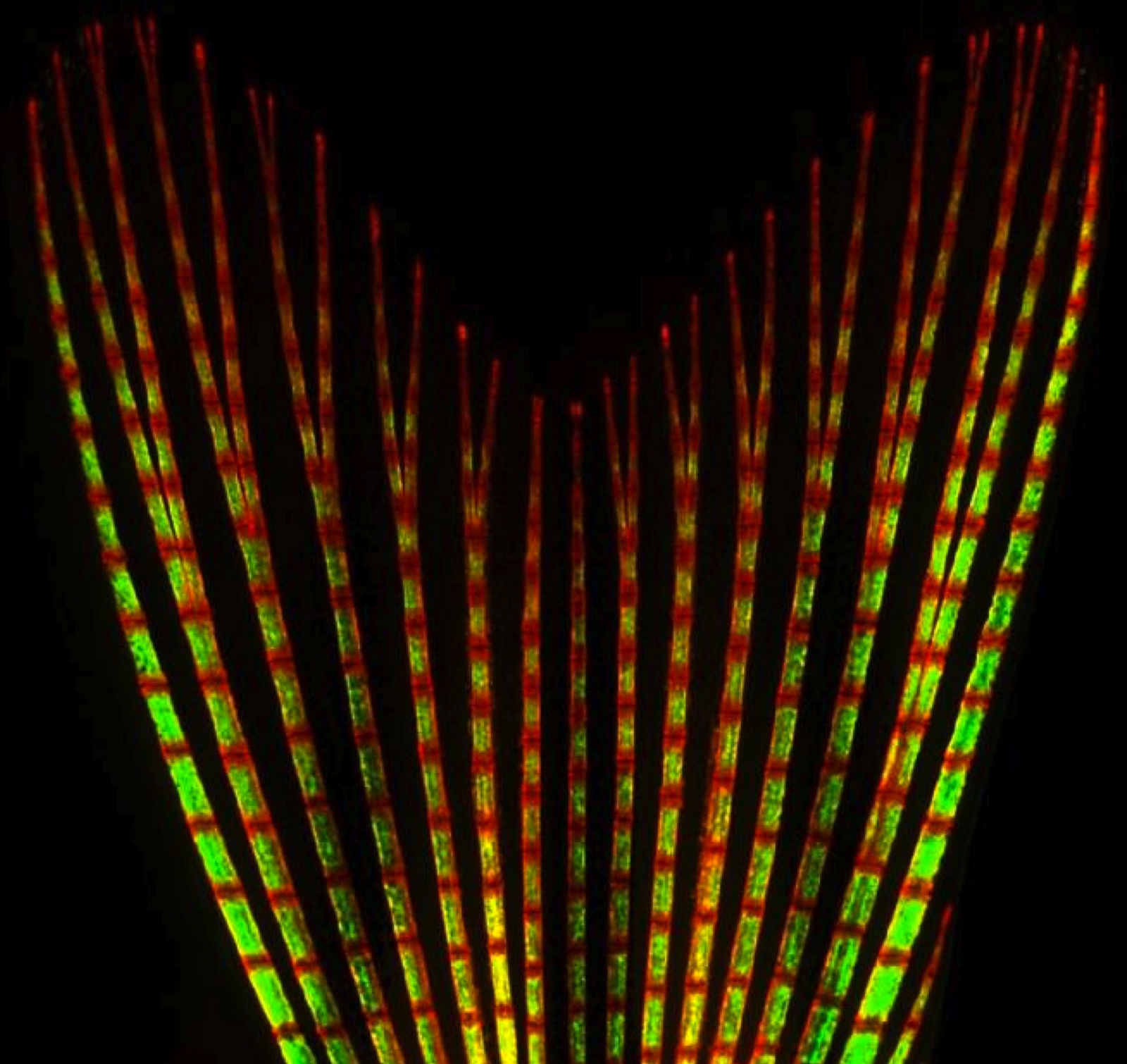 虽然大多数斑马鱼研究的重点是在生命最初几天心脏和其他器官的最初胚胎发育,但Poss的团队是少数几个研究后期心脏再生的团队之一。为了做到这一点,他们开发了研究成年鱼的新工具,包括几十种转基因品种,以帮助可视化不同的细胞类型。珀斯实验室的研究生维卡斯·古普塔(Vikas Gupta)是第一个适应的人脑弓技术(最初为小鼠的研究开发)进行颜色编码的斑马鱼心肌细胞 - 允许他们从心脏周围的亲本细胞迁移和分化进行跟踪子代细胞。古普塔开发出一种技术用于表达不同量的心肌细胞内的红色,蓝色和黄色的蛋白质,在超过20种不同颜色标记它们。这个突破使团队能够像心脏发育和再生过程的细节因为每个细胞都会永久保留其颜色,并将其传递给从中分裂出来的新细胞。通过显微成像,研究小组可以清楚地记录鱼类心脏从胚胎到成年以及心脏损伤后修复过程中的细胞分裂和迁移模式。事实上,Poss的研究人员是第一个使用Brainbow来定义细胞在器官发育过程中的行为的人。