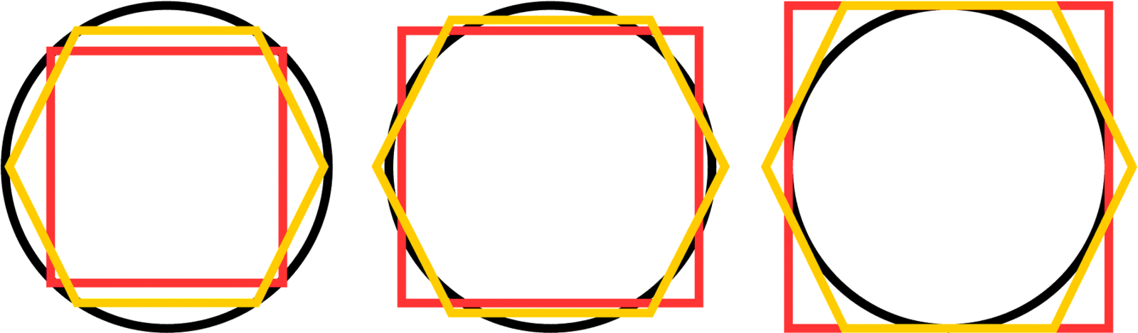 所有这些相关性都是中学时就知道的。但是,可以自由比较不同的大小:例如,可以比较适合圆的内接六边形。在这种情况下,面积的比率为AC:AH:As= 100: 83: 64。正方形的大小大约比六边形的小30%。这个结果被用来宣称当使用六边形针孔比方形针孔时“达到更高的亮度30%”。这份声明是官方发布的,甚至在公共网站上也有。