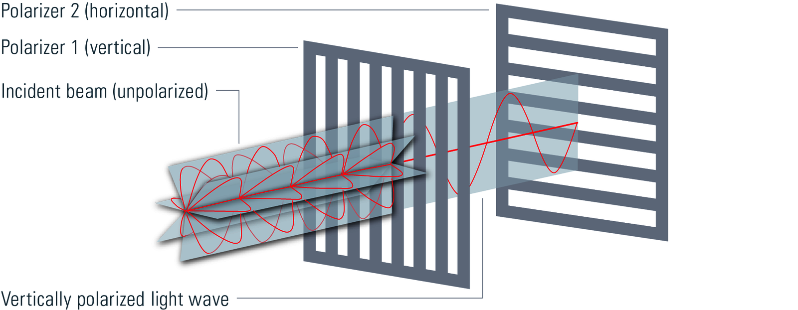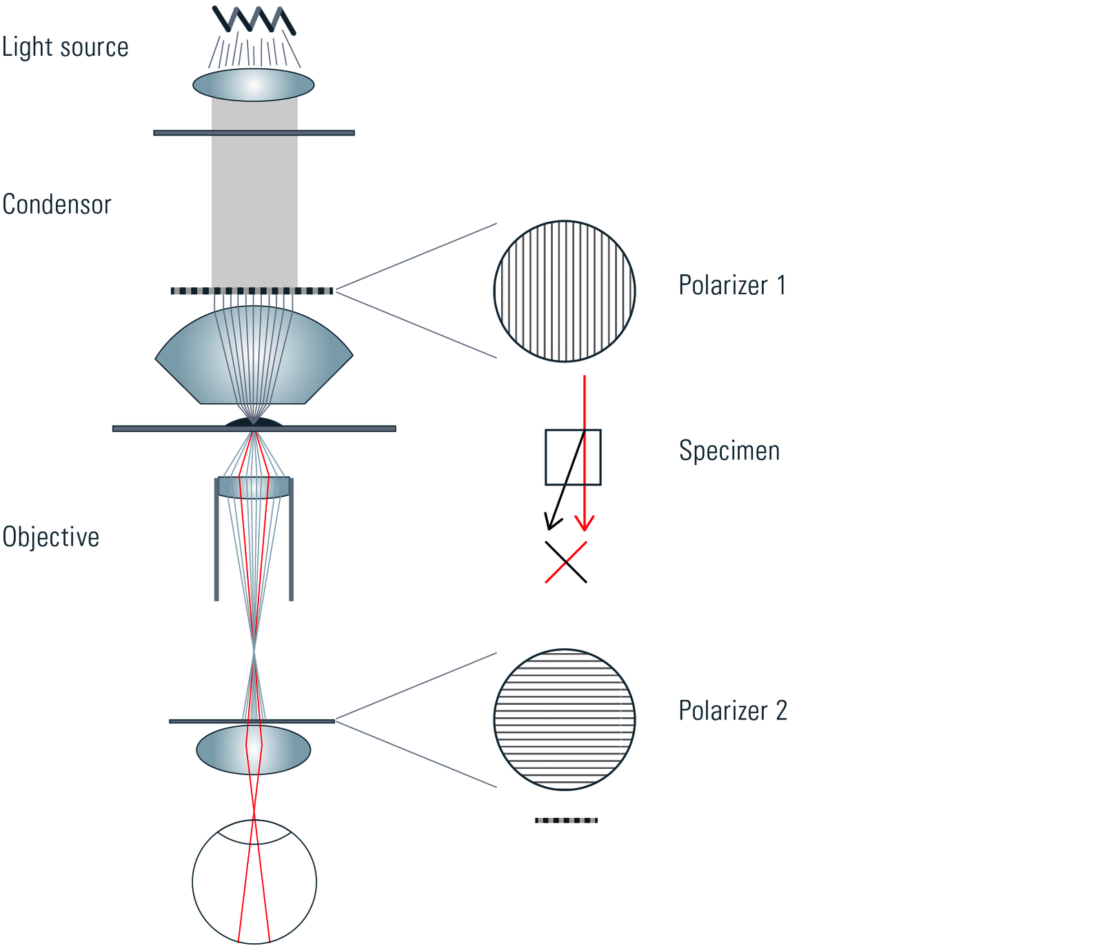 当光通过第一个偏振光滤片时,产生线偏振光。如果线偏振光在正确的偏振面穿过双折射材料,它会发生折射并分裂成两束姐妹光,其中一部分光线的偏振面会旋转90°。折射的光线然后通过第二个偏振器(分析仪),如果它正确对齐(即相对于第一个偏振器90°)。因此,只有双折射材料在偏振光显微镜下才能产生图像。