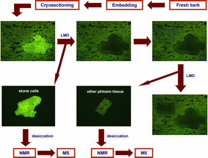 图1:显示联合激光显微切割关键步骤的流程图(LMD.)/NMR/MS协议(修改后)[2]).经Springer Science+商业媒体善意许可:Li S-H、Schneider B和Gershenzon J:利用低温核磁共振光谱对挪威云杉的激光显微切割石细胞进行微化学分析。Planta 225(3):771-79(2007);内政部:10.1007/s00425-006-0376-z。
