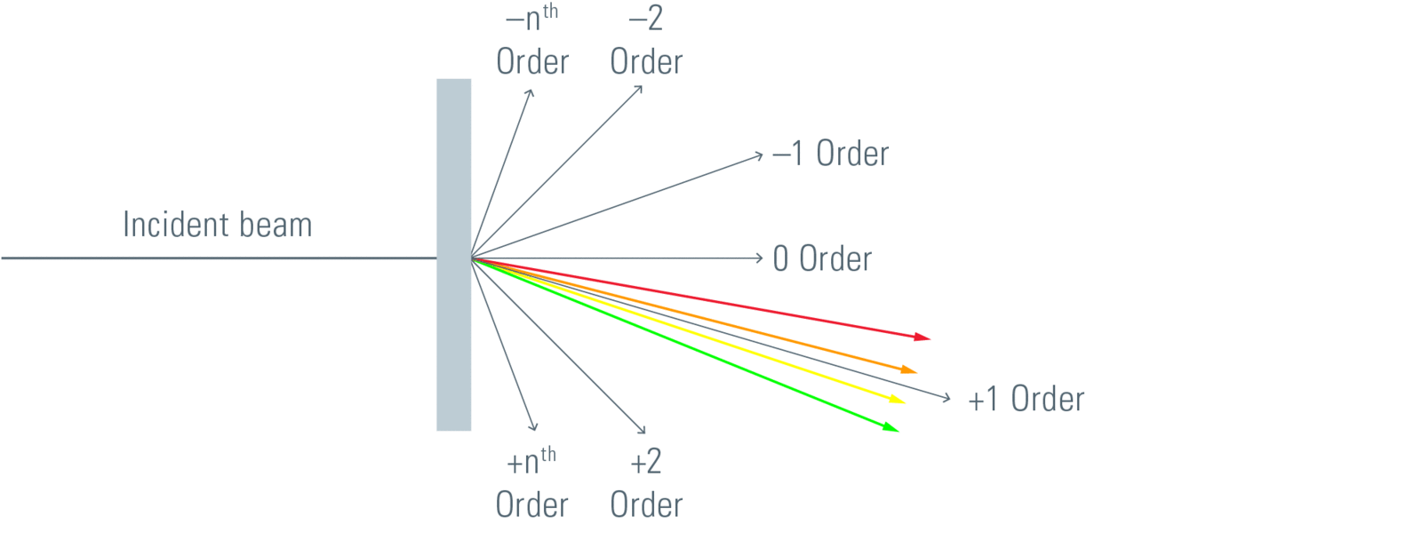直线方向(0th命令)不显示任何色散。1圣顺序通常是选择的方向。在这里,光被传播成光谱,非常类似于棱镜中的色散。然而,还有更多的顺序,例如2钕和更高的订单,但订单反映了1圣…nth光栅另一侧的顺序正常。光栅制作的艺术在于将尽可能多的能量集中在一个单一的顺序中。