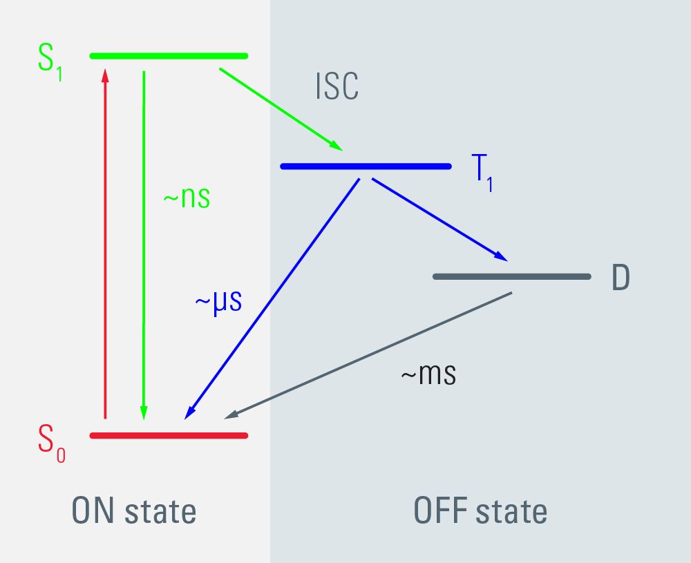 在传统的荧光显微镜中,荧光染料中的离域π电子从基态S转移0到激发态1.当它们振荡回到基态S0,它们发出荧光灯。的GSDIM该技术通过将大多数荧光染料切换到暗状态(图1)来降低参与该振荡循环的电子数(Fölling等人,2008年,Bierwagen等人,2010年,Testa等人,2010年)。这减少了可激发荧光团的数量,直到可以检测到单个分子。然后,单个分子自发地从暗态返回到可激发基态并发出荧光,而其他分子则通过切换到暗态而再次失活。结果,荧光团分子在样本中亮起或“闪烁”。单个荧光团的准确位置可通过算法确定。所有荧光团的位置信息收集在数千张单独的图像中,这些图像的坐标用于计算超分辨率GSDIM的形象。结构显示在GSDIM因此,图像以类似于点画风格的方式产生。