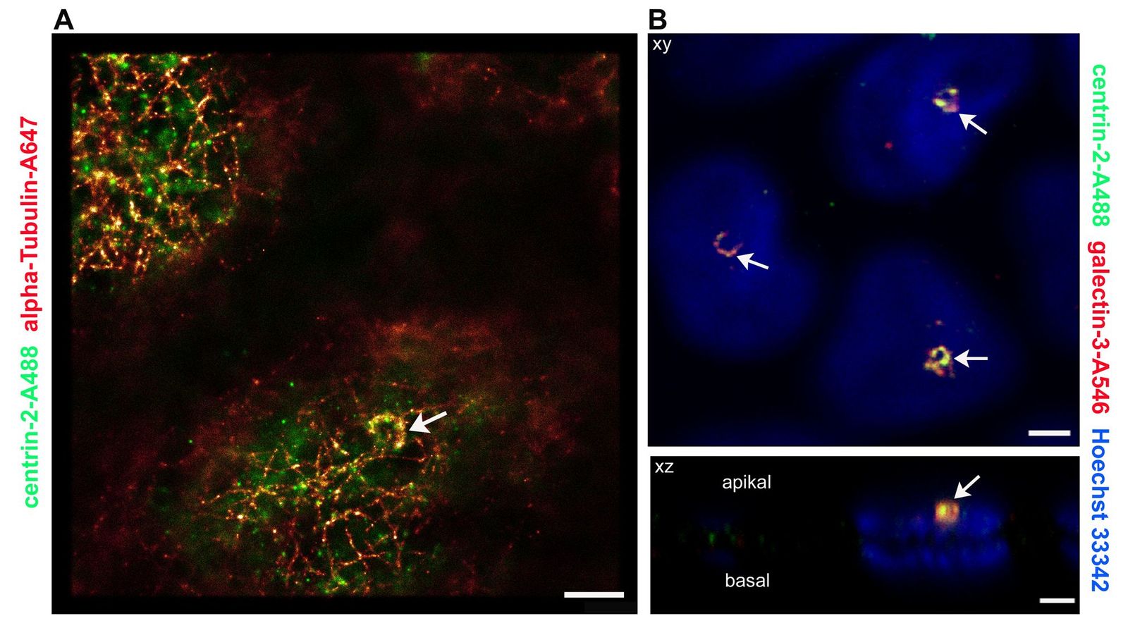 徕卡SR GSD (Leica Mi188金宝搏的网址crosystems, Wetzlar)是一种新型的多用途显微镜,不仅可以用于超分辨率GSDIM成像到20纳米的分辨率,而且TIRF显微镜(全内反射荧光)和高速宽场活细胞成像。这使我们对亚尖端膜的结构及其蛋白质组成有了新的、极其详细的了解。采用免疫组织化学方法,用微管蛋白对中心蛋白-2进行双重染色,并用GSDIM技术(图2A)。根尖膜下的微管网络清晰可见。其他可见特征是半圆形到圆形的中心结构,每个单元显示一次。这些结构排列在基体周围,也被中心蛋白-2染色。在此之前,我们也能看到类似的centrin-2分布模式。图2B显示了centrin-2与其结合伙伴galectin-3的双重染色(Koch等人,2010)。然而,传统制作的图像比超分辨率图像提供的蛋白质分布更为分散GSDIM的形象。