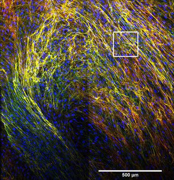 弹性蛋白是一种必需蛋白质,存在于需要弹性和灵活性的各种组织中,如皮肤和心脏。在设计合适的植入物时,需要弹性纤维来进行足够的组织更新。然而,人类弹性生成的可视化仍然是黑暗的。到目前为止,在人细胞环境下的人体对流层弹性蛋白(TE)的生产及其纤维在活细胞条件下的组装尚未实现可视化。在这里,我们提出了一个长期的人真皮成纤维细胞表达荧光标记的人TE的细胞培养模型。我们采用慢病毒系统稳定过表达黄嘌呤标记的TE,构建荧光纤维网络。通过免疫荧光,我们证实了柠檬黄标记TE的功能。此外,我们使用共聚焦显微镜观察了纤维组装的过程。应用超分辨率显微镜,我们能够研究弹性蛋白-纤维蛋白-1纤维网络的内部结构。未来的调查将允许跟踪在不同条件下产生的TE。 In tissue engineering applications the fluorescent fibre network can be visualized under various conditions or it serves as a tool for investigating fibre degradation processes in disease-in-a-dish-models.
